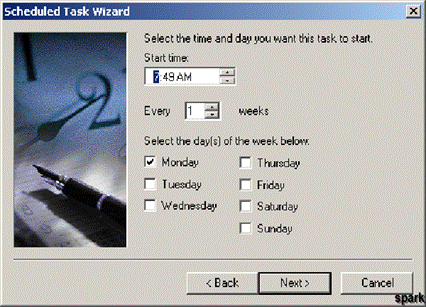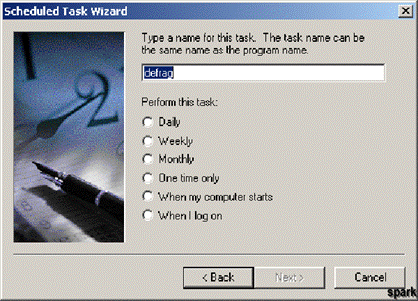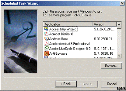 Go to Start > Settings > Control Panel > Scheduled Tasks > Add Scheduled Task > the Scheduled Task Wizard will appear, click Next.